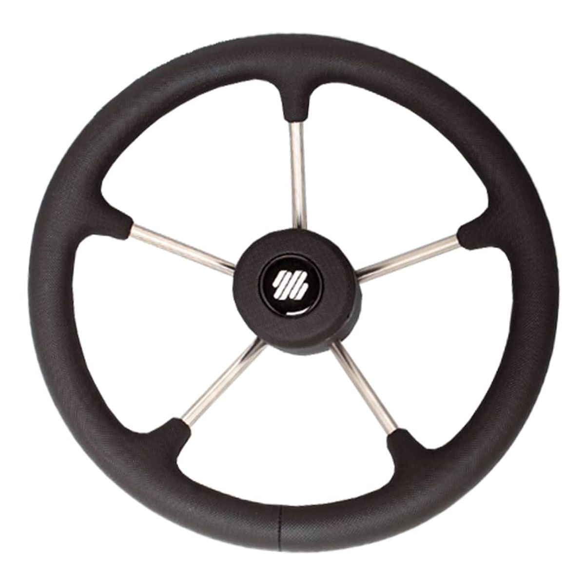 Ultraflex 39442D B/S 5-spoke steering wheel made from non-magnetic stainless steel spokes with black hub and black firm grip. This wheel measures 350mm (13.8″) in diameter, 90mm (3.5″) dish depth and features a standard 3/4″ taper.